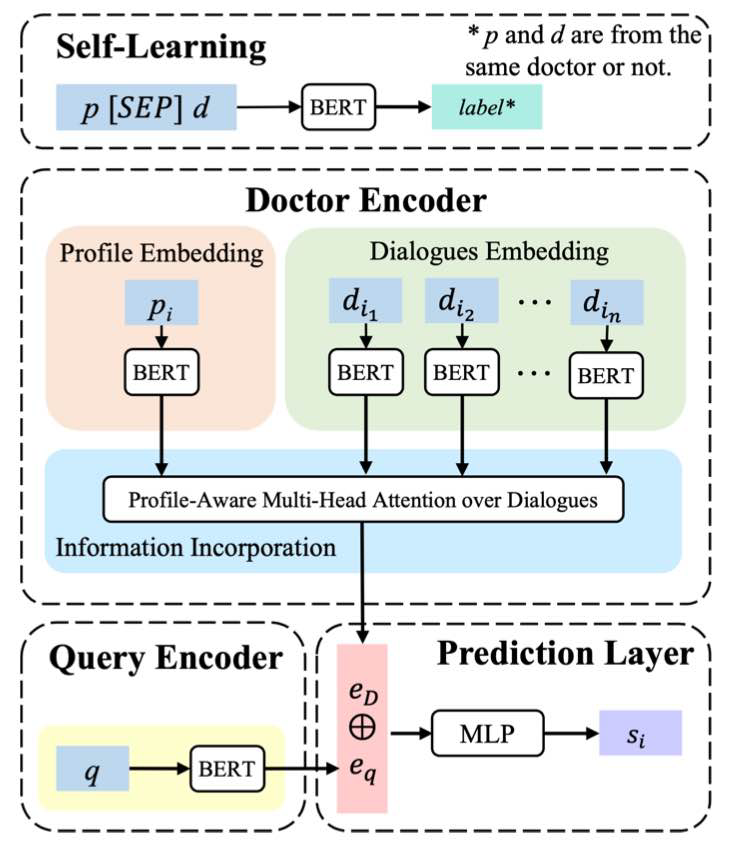 This self-learning task is to predict whether a profile and a dialogue come from the same doctor, where random profile-doctor pairs are adopted as the negative samples. We first fine-tuned mc_bert_base (a pre-trained Chinese Biomedical BERT) via self-learning.