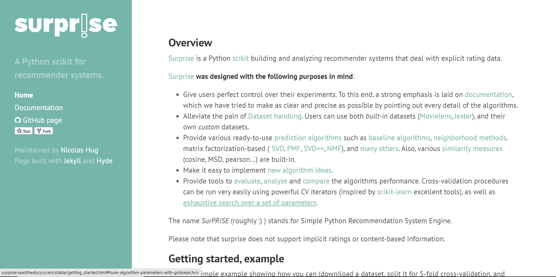 - Surprise is a scikit (or scientific kit) for building recommender systems in Python. You can think of it as scikit-learn's recommender systems counterpart. This is because it is extremely robust and easy to use. It gives us ready-to-use implementations of most of the popular collaborative filtering algorithms.