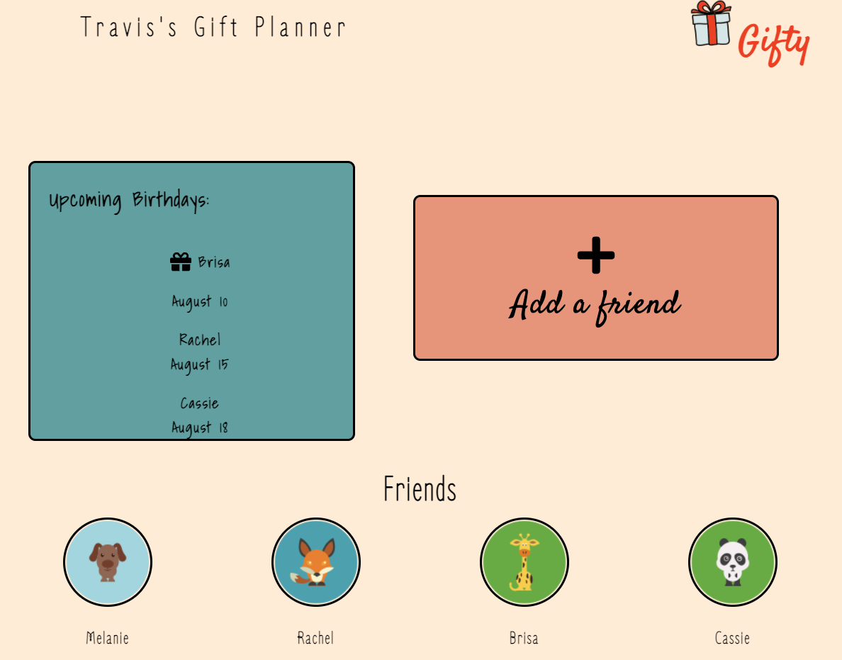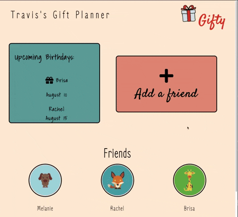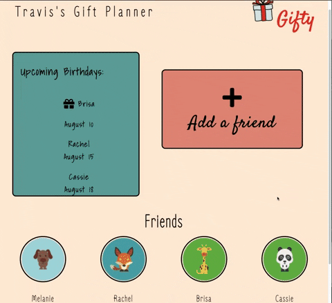 Our team utilized Agile methodologies and a git rebase workflow to collaborate on Gifty, an application to keep track of dates and gift ideas for friends' birthdays. We have all had the experience of shopping last-minute for a birthday gift you forgot to purchase, and settling on something less-than-stellar for an amazing friend. With Gifty, you'll never spend the day before a birthday desperately browsing Amazon again.