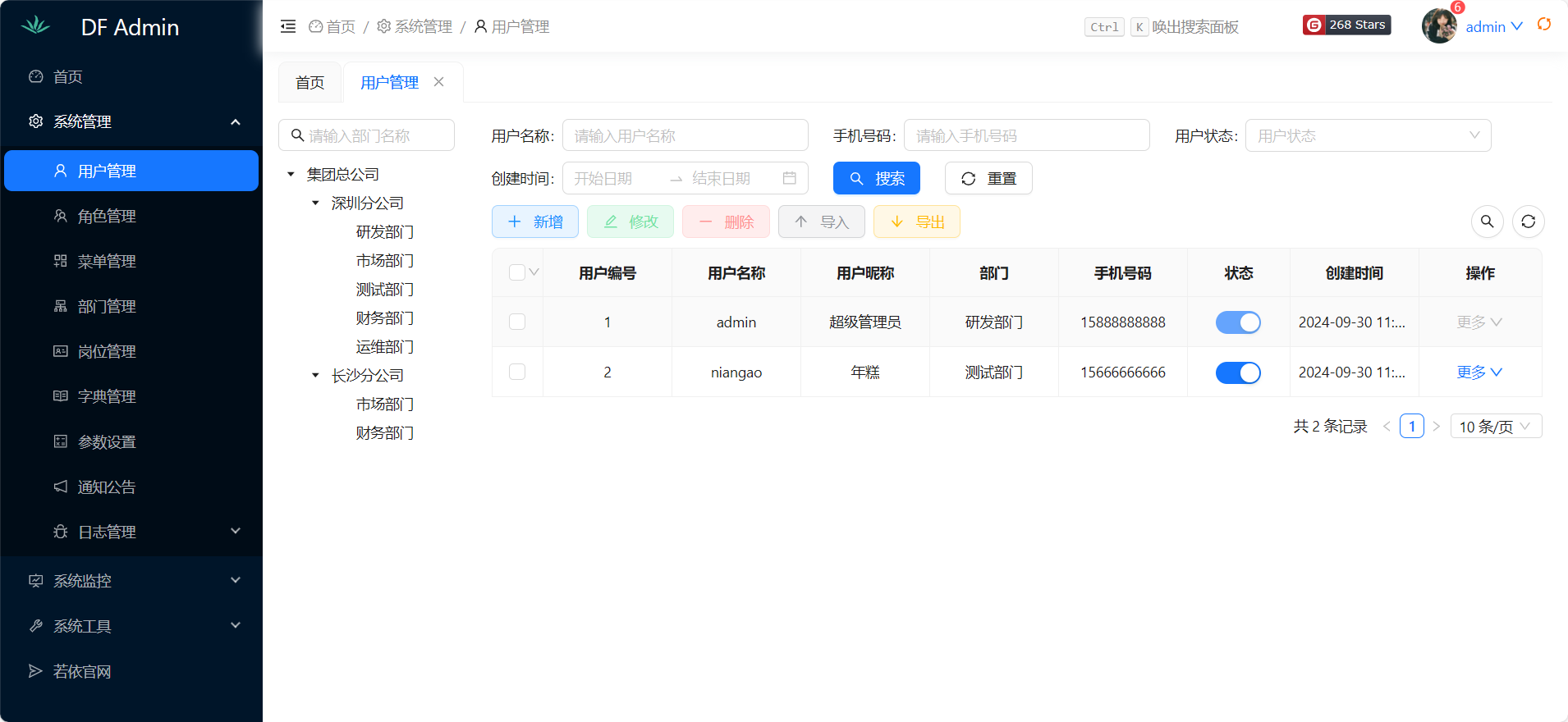 - 部门管理:配置系统组织机构(公司、部门、小组)。