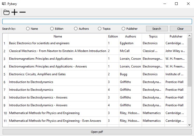 The GUI is written using PyQt5, and the add, delete and open icons used were taken from Bootstrap Icons. The book icon for the window was taken from SVG Repo.
