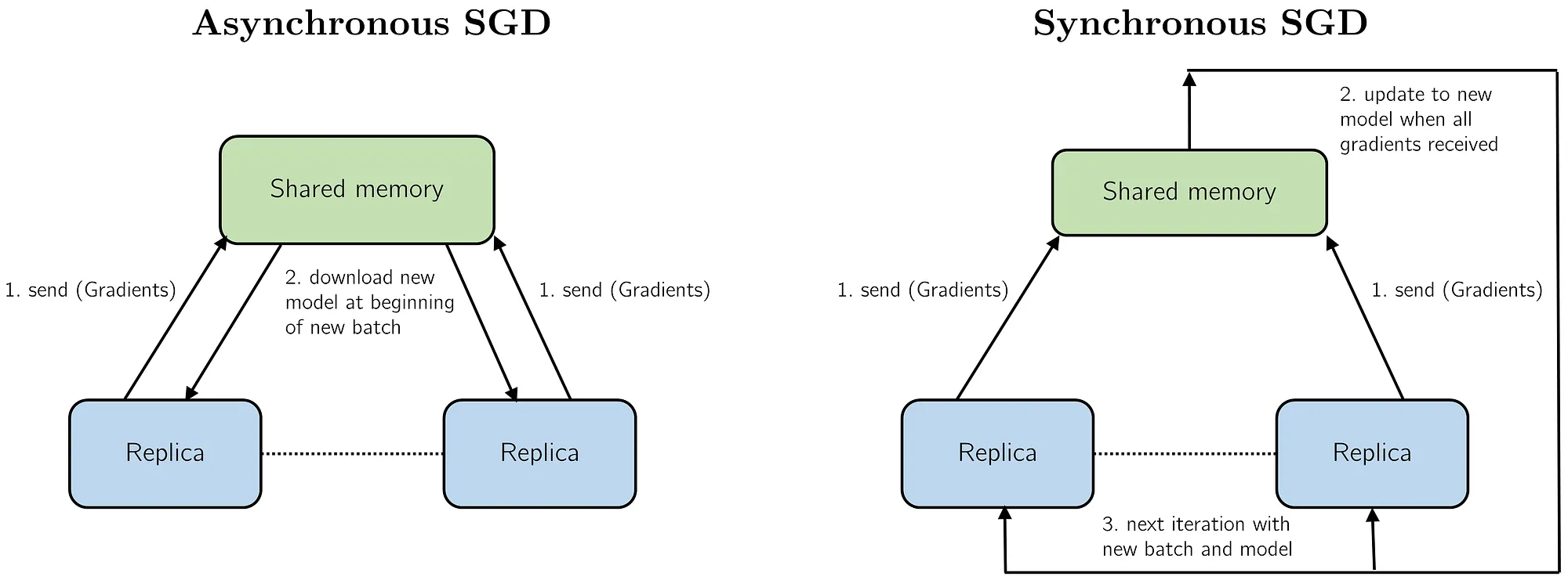 - Synchronous SGD: workers send their gradient to the parameter server, once the gradients of each worker are received, the parameter server averages them and update the global model and workers fetch the same global model.