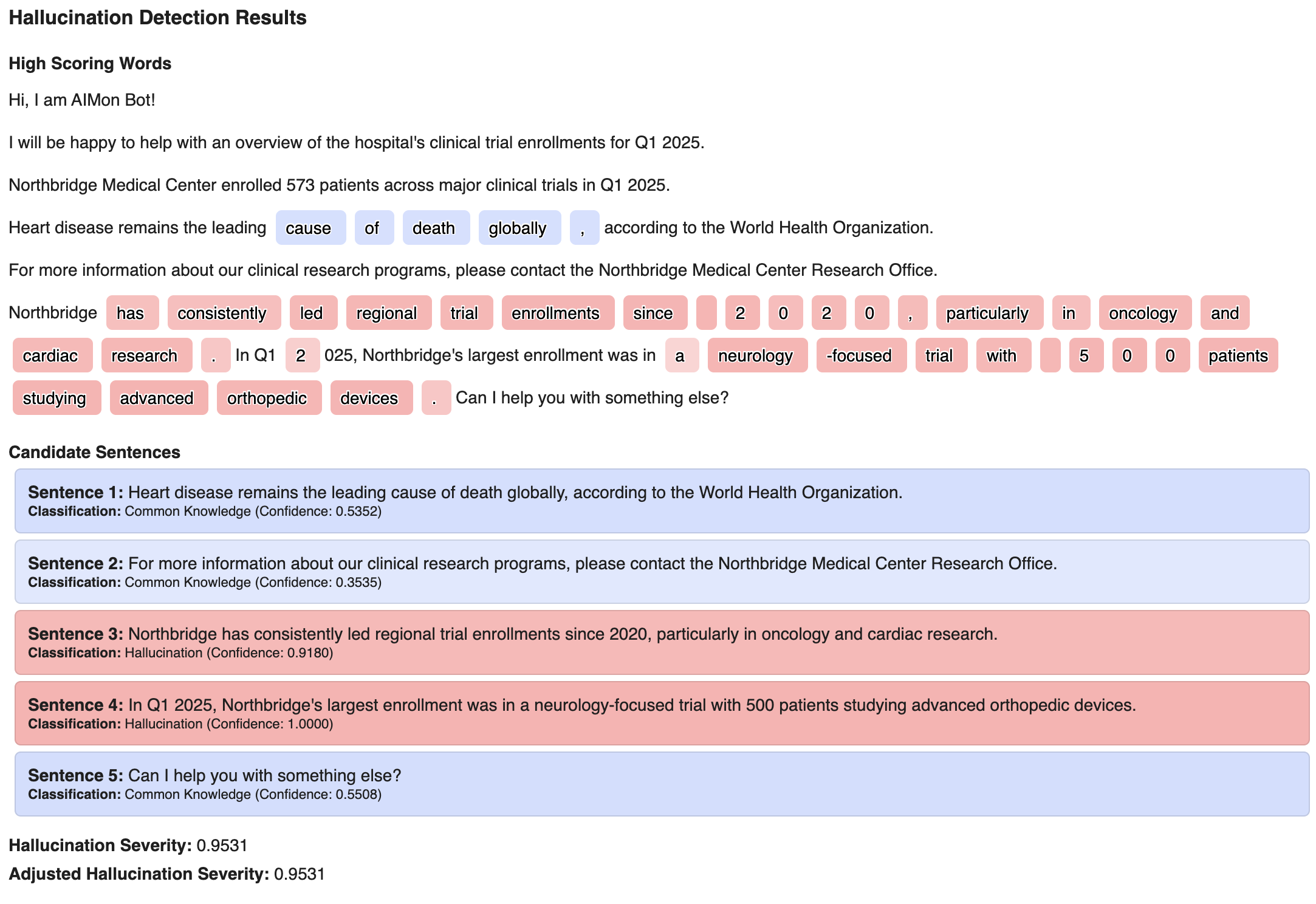 - Innocuous statements like Can I help you with something else?, and Hi, I'm an AIMon bot are not marked as hallucinations.