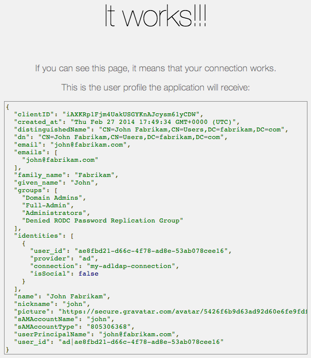 or you are outside your intranet you will be prompted for credentials. After successful authentication you should see the test screen showing the user profile: