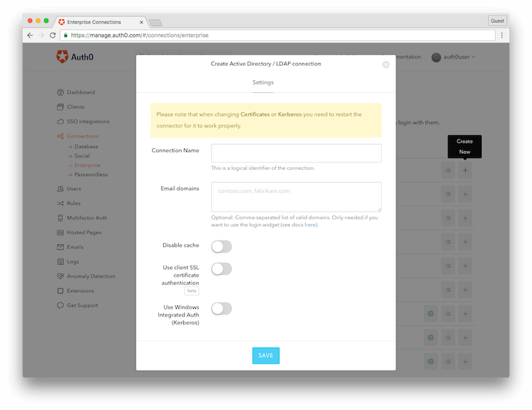 Configuring an AD/LDAP connection in Auth0 requires two simple steps: