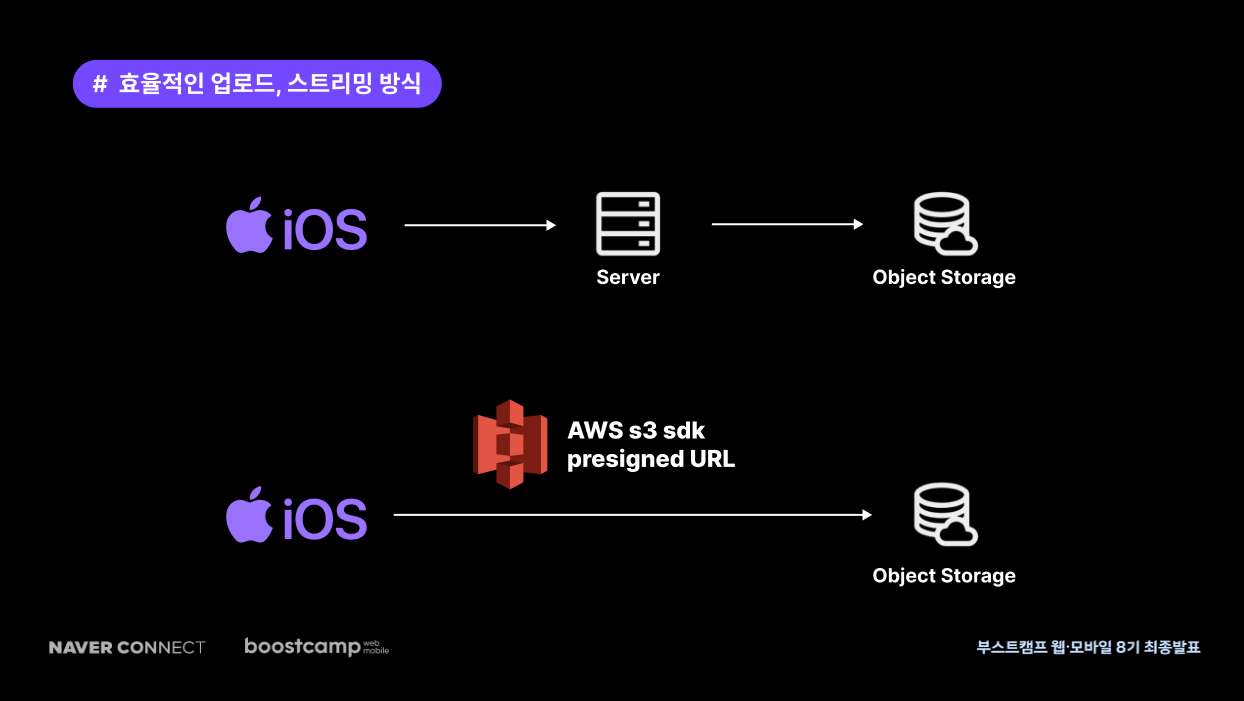 : 단순히 URL을 통하여 업로드 함으로써 iOS, 서버 양쪽의 구현 단순화