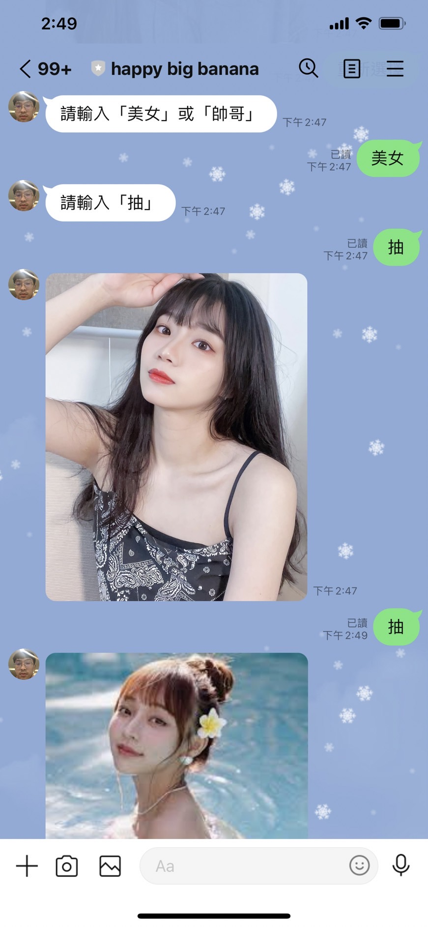 加入好友後,輸入「美女」或「帥哥」,接著輸入「抽」即可獲得一張美女或帥哥的圖片,輸入「重新輸入」即可重新做選擇