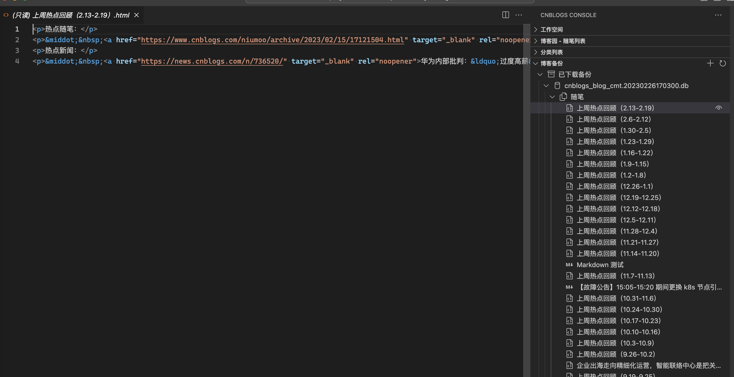 当点击列表中的博文时,会自动将博文内容下载到工作空间一个本地文件中(此时这个本地文件就关联到了这篇博文),完成编辑后可以再将本地的内容上传到博客园。