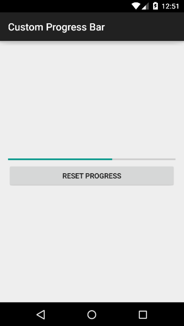The skeleton app contains a GoalProgressBar class which extends Android's ProgressBar, but doesn't add any additional functionality. Clicking on the Reset Progress button will update the progress to a new value, which will help us test our changes during development.