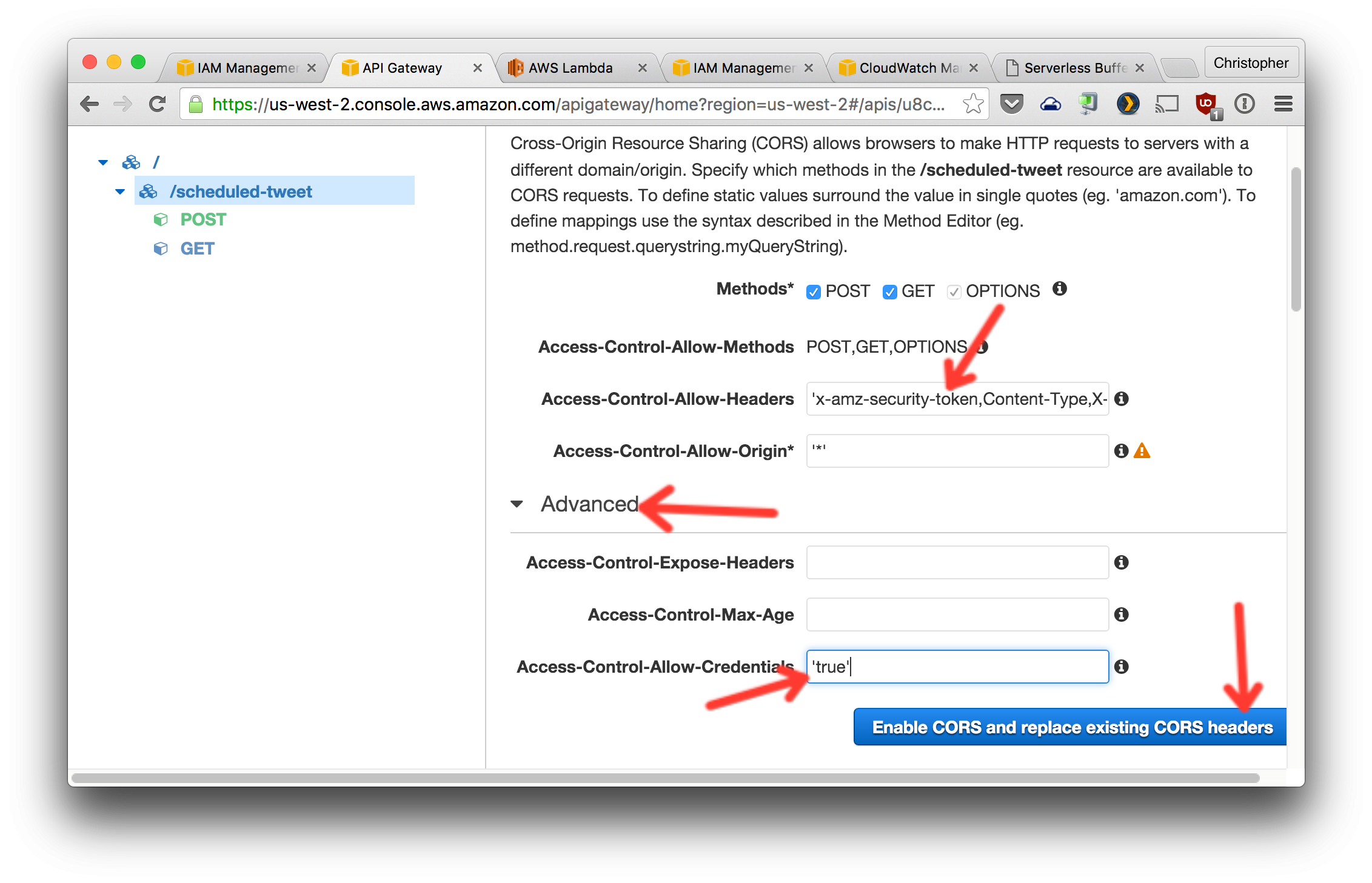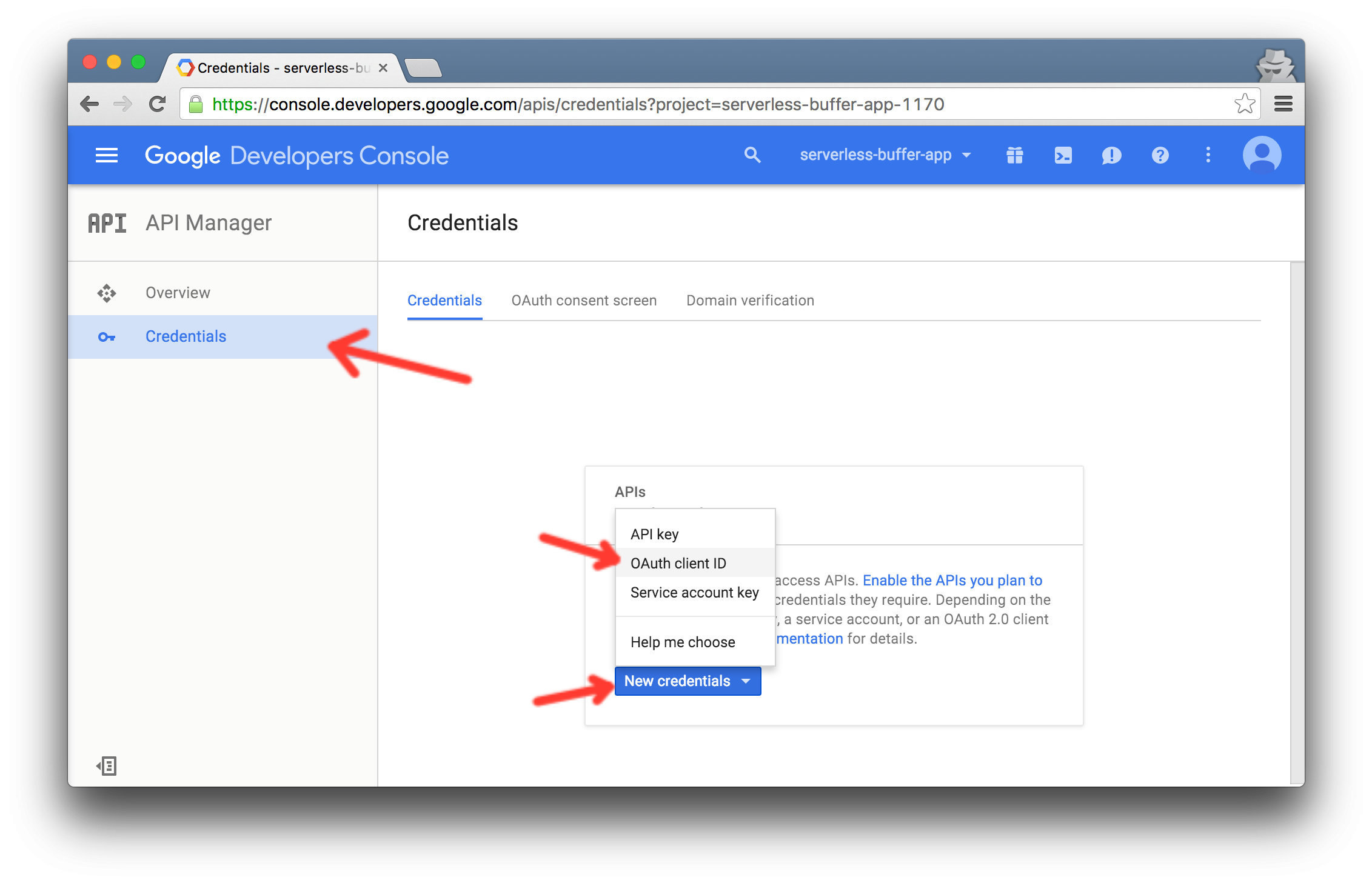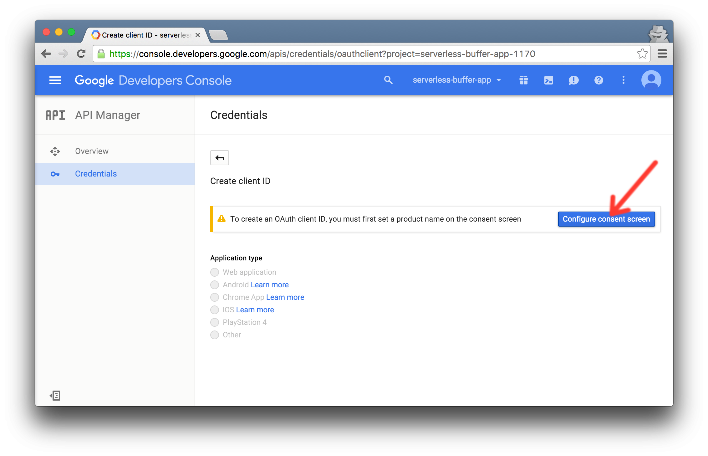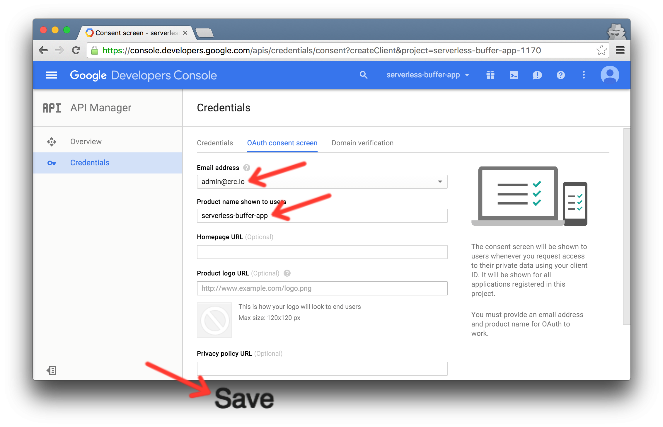 - Configure OAuth. Add all the domains from which your app will be hosted (e.g. http://localhost:8080 and http://tweet.crc.io). Save the client ID you get for later.