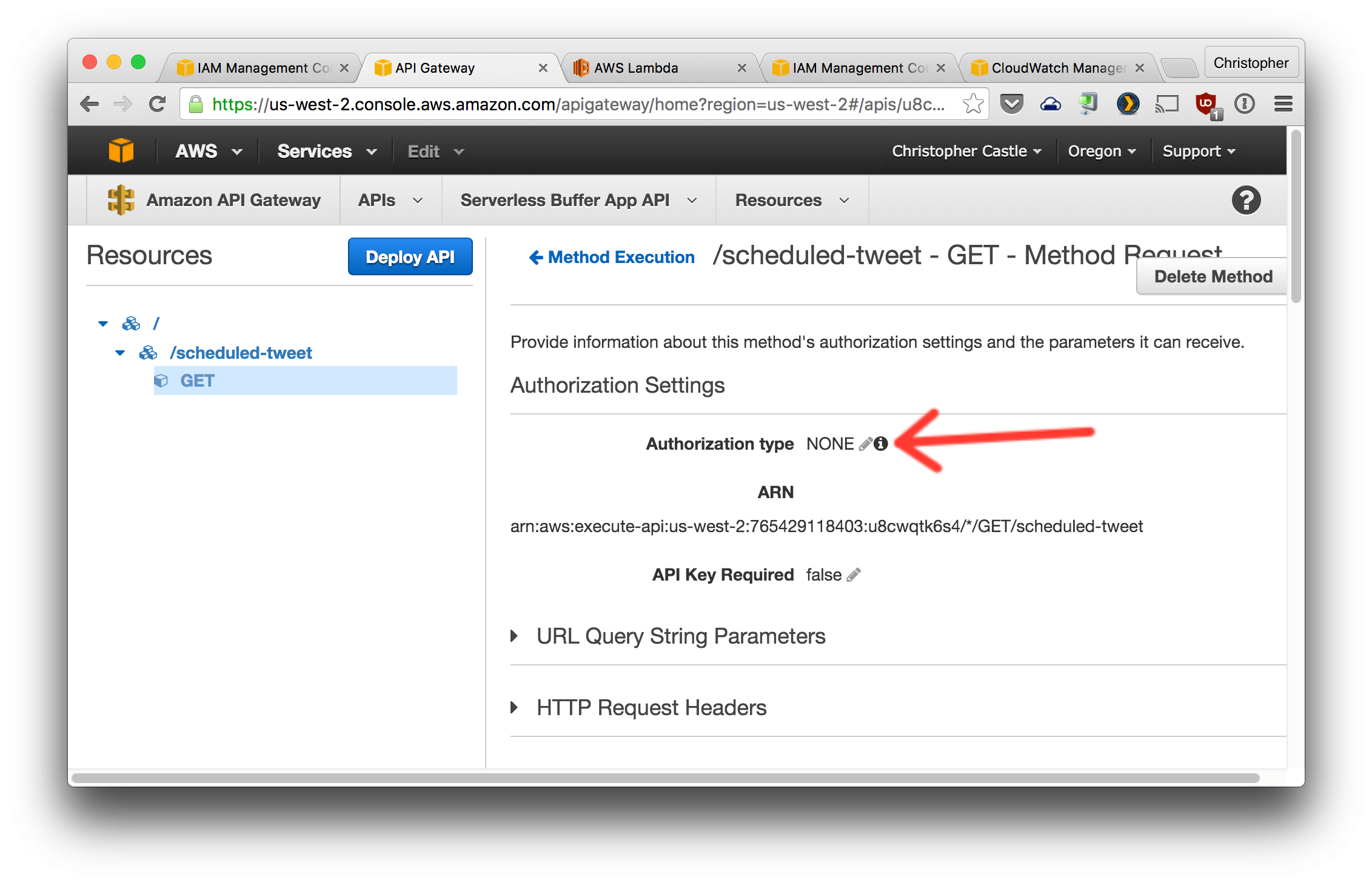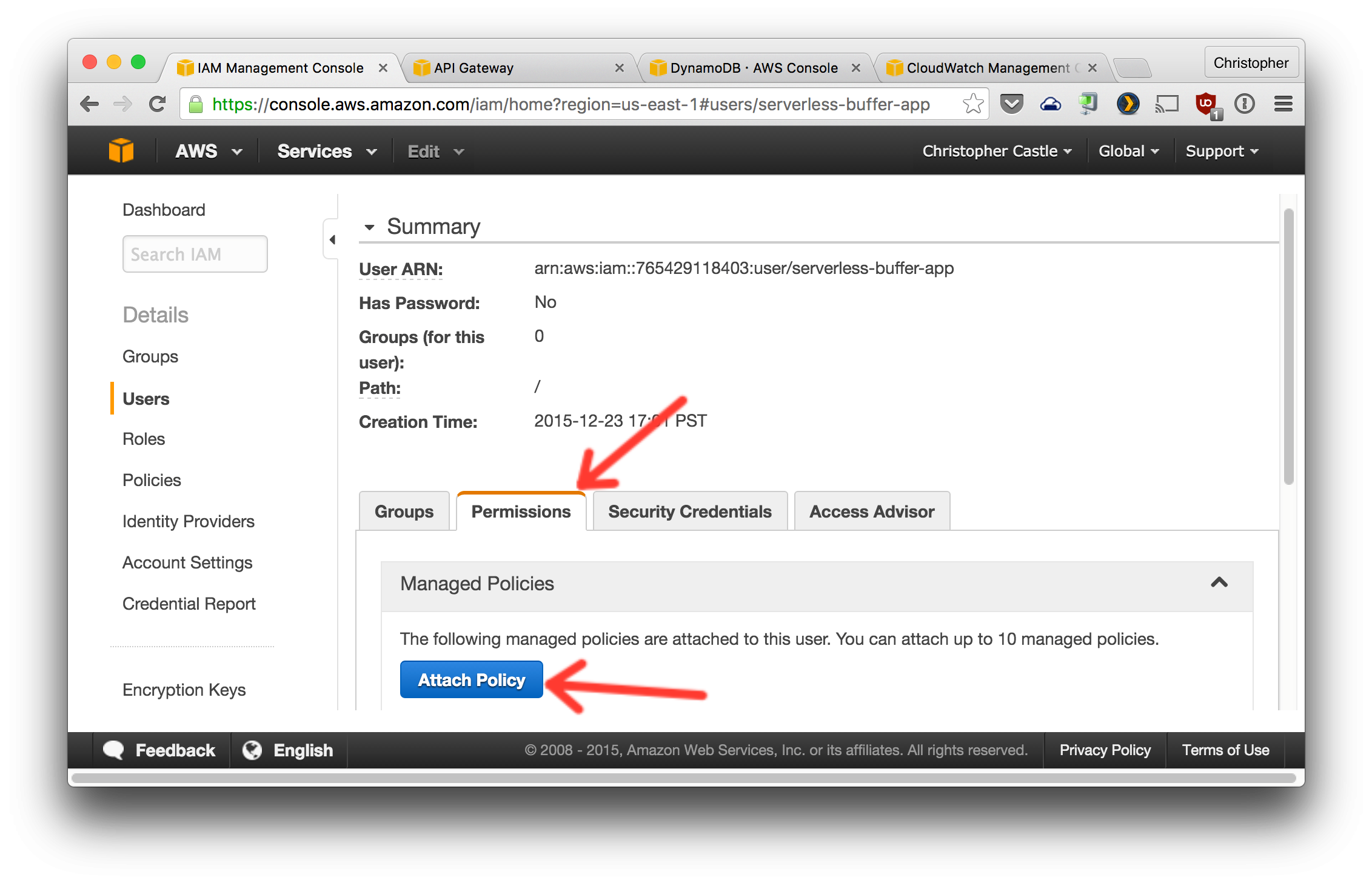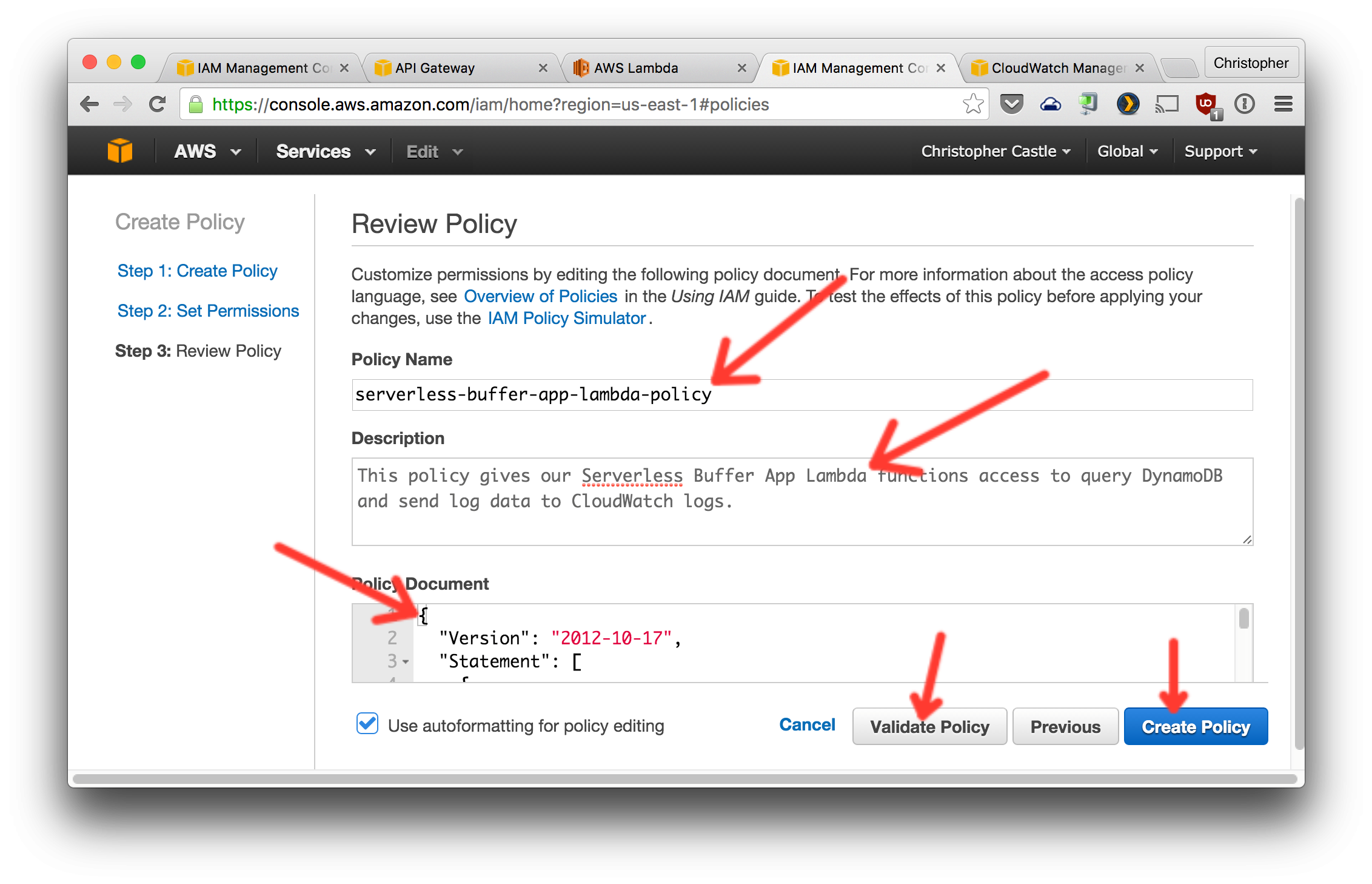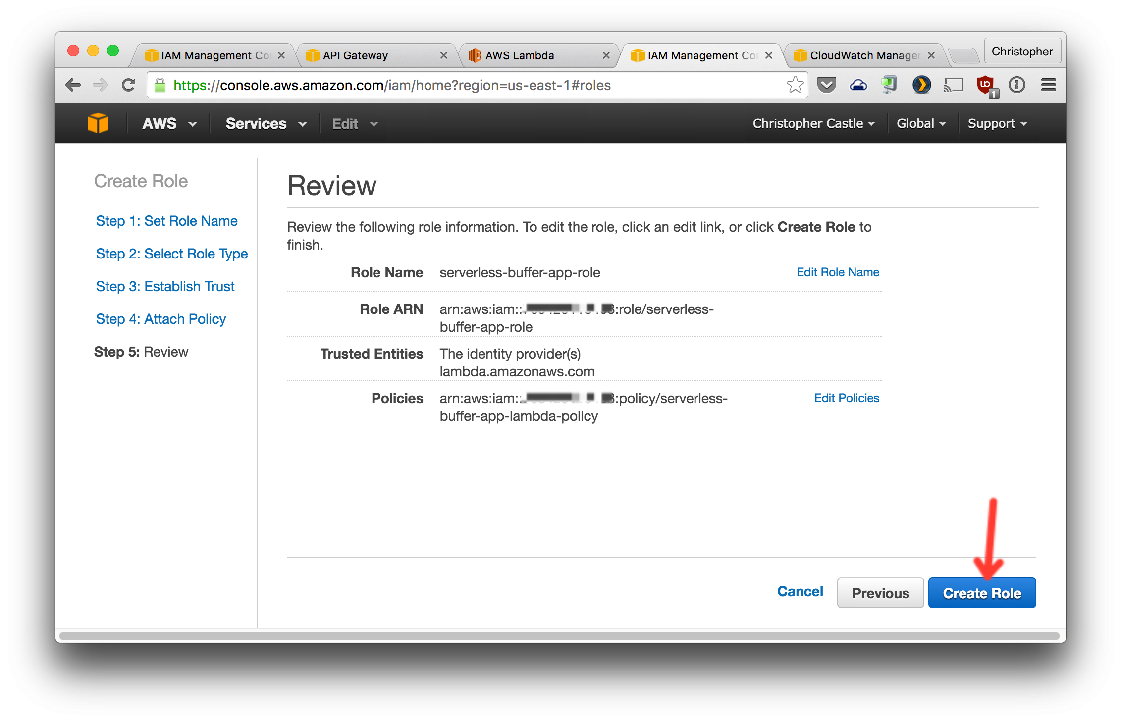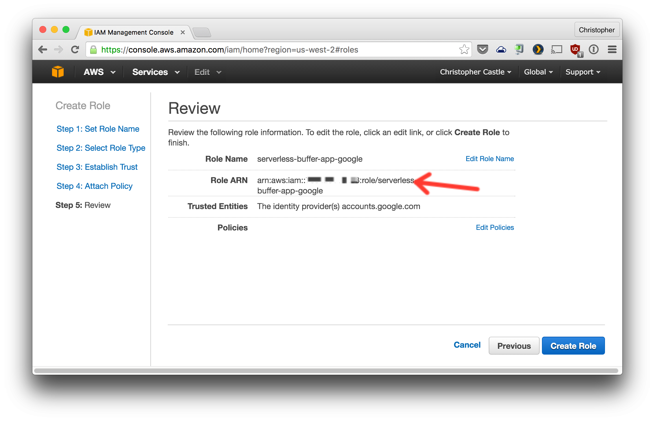 - Copy/paste the new role's ARN to the serverless-buffer-app-gui config file and finish creating the role. (TODO: update path of config file)
