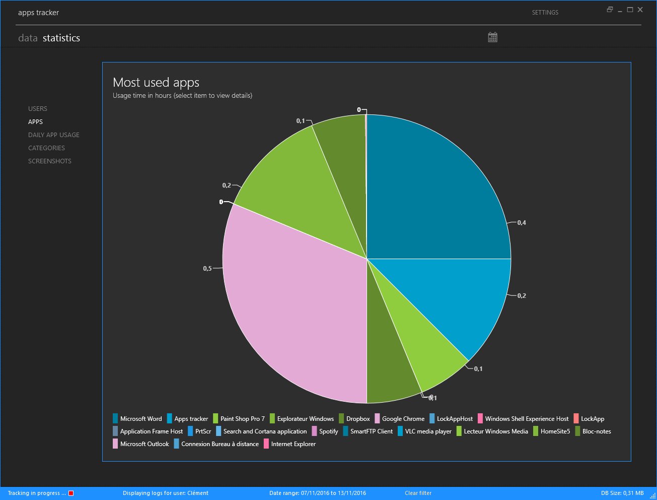 Apps tracker Windows desktop application for tracking computer usage. C#, WPF, MVVM Download link Written by Marko Devcic License CC-4.0