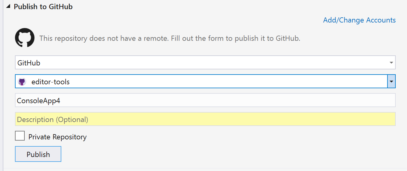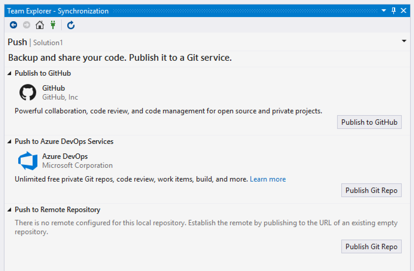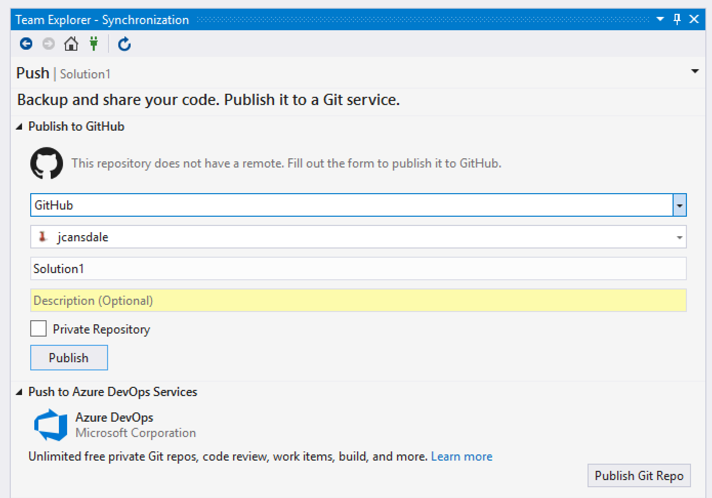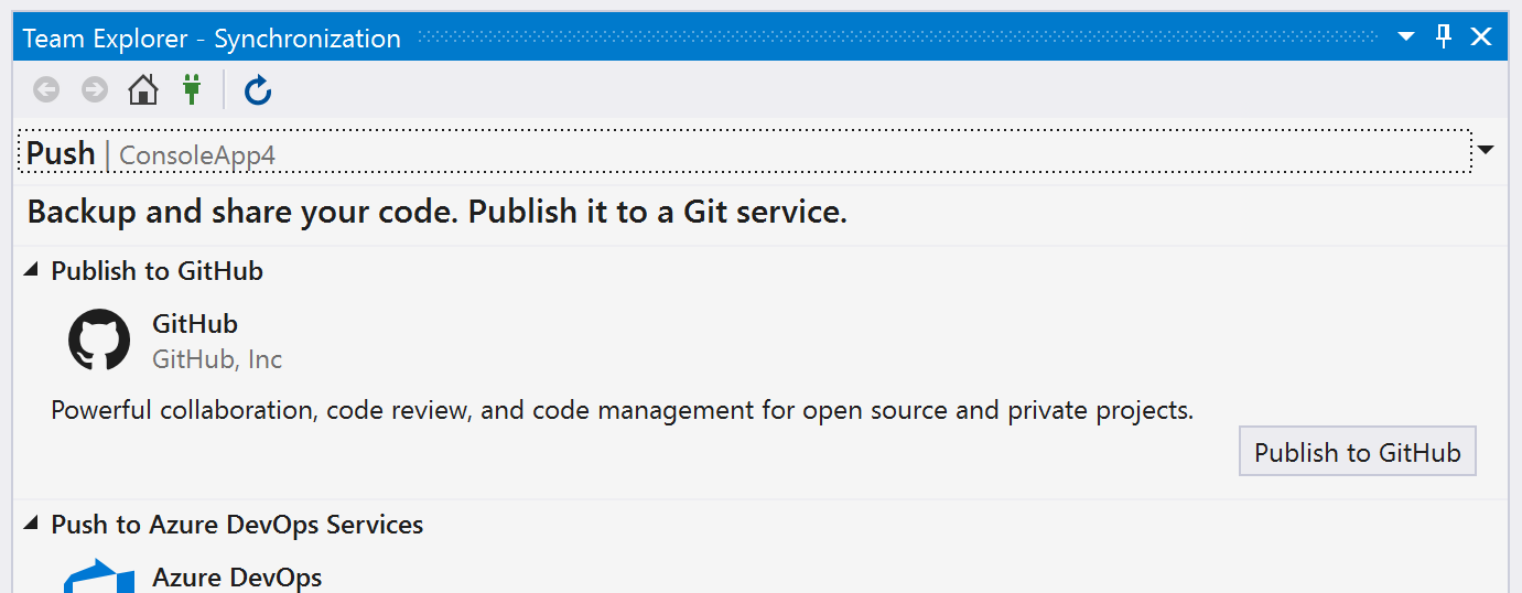 Publish to GitHubsection toTeam Explorer - Synchronizationpage:When