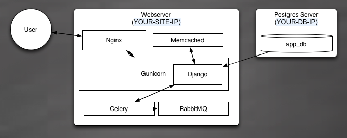 Basically, users send HTTP requests to your server, which are intercepted and routed by the nginx load balancer. Requests for dynamic content will be routed to your WSGI[3] server (Gunicorn) and requests for static content will be served directly off the server's file system. Gunicorn has a few helpers, memcached and celery, which respectively offer a cache for repetitive tasks and an asynchronous queue for long-running tasks.