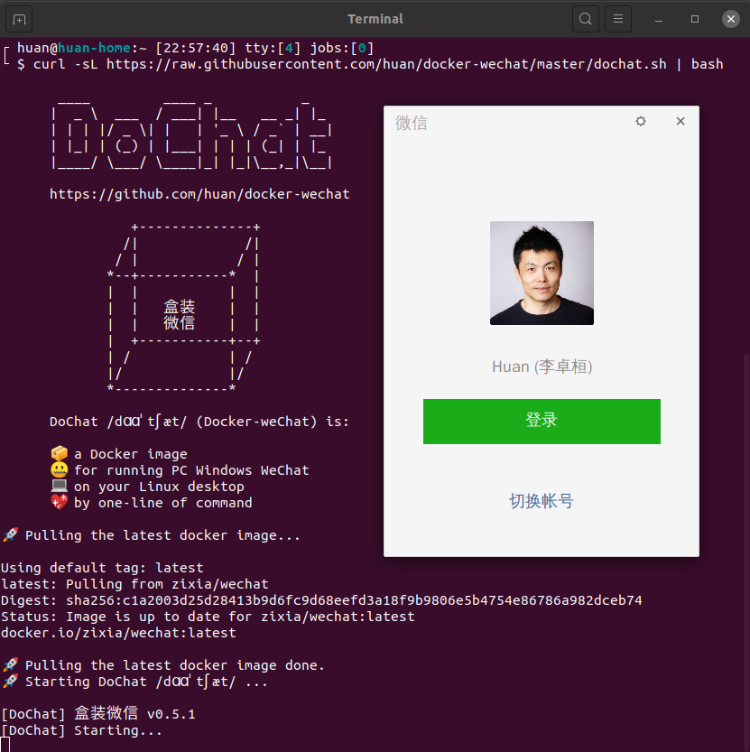 curl -sL https://raw.githubusercontent.com/huan/docker-wechat/master/dochat.sh | bash