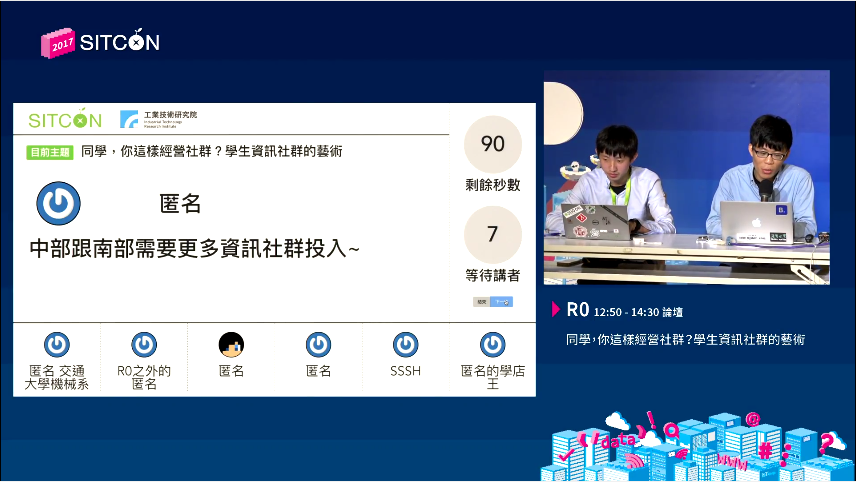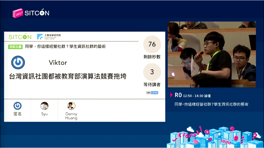 設定可省略此步驟) 排入發言佇列。發言佇列介面會透過投影機展示給所有參與者,即時呈現最近六位發言者、目前發言者,目前討論主題(由主持人介面設定)以及計時器剩餘時間。