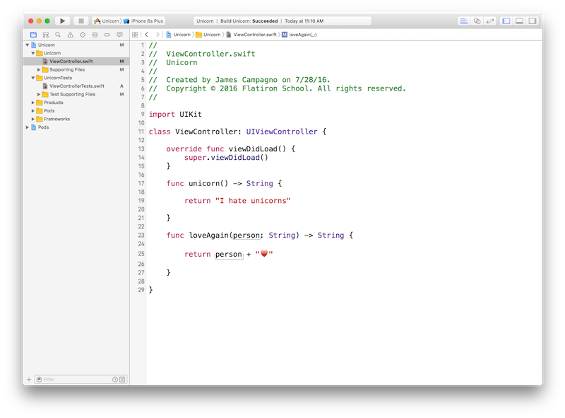 We know our test file (ViewControllerTests.swift) is looking for us to implement these functions correctly. We know we run these tests by pressing (command + u), but what happens if we didn't implement these functions correctly. Lets instead of returning back a unicorn emoji, return back the string literal "I hate unicorns". So now our implementation looks like this: