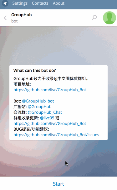 “GroupHub_Bot”是一个收录telegram中文圈群组的机器人。