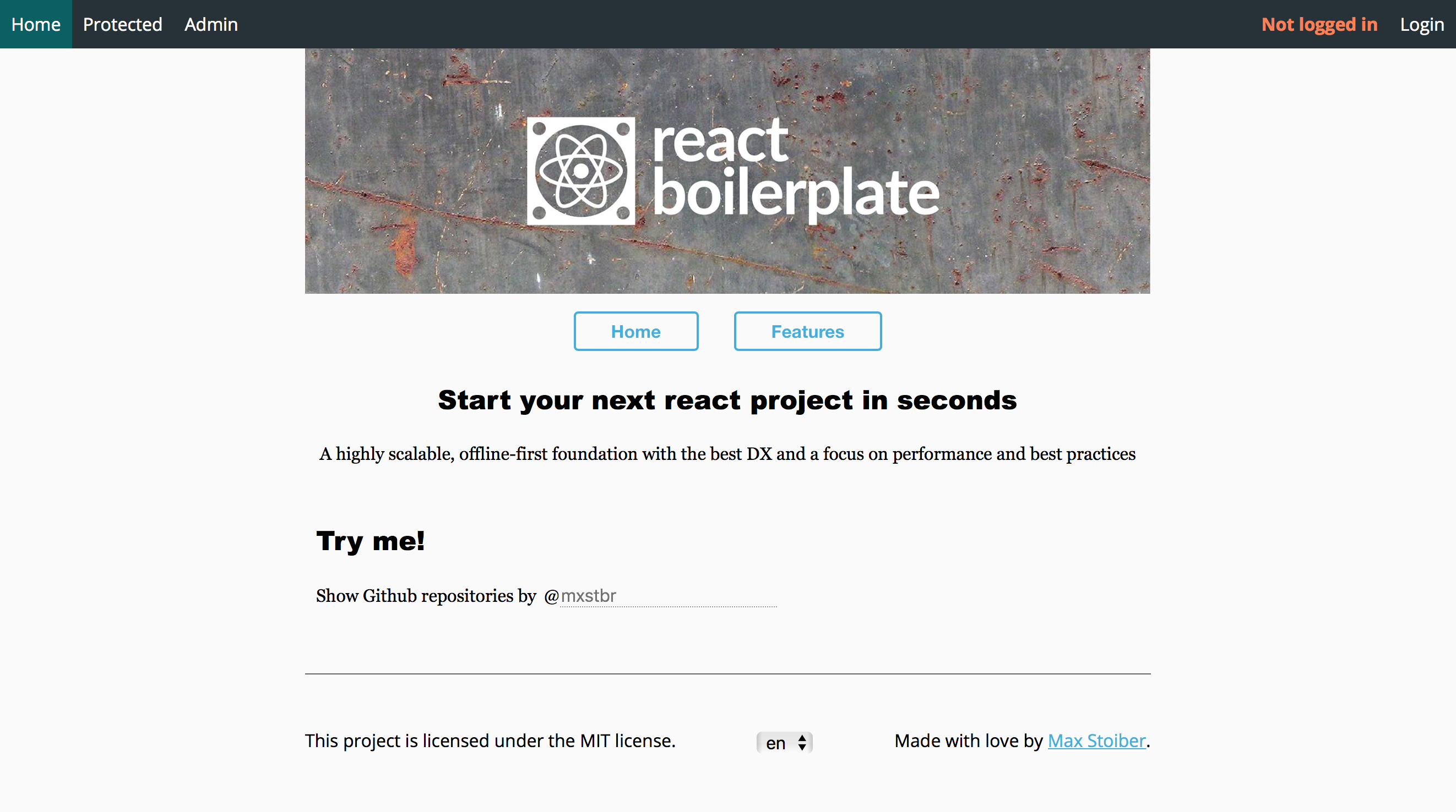 This is forked version of react-boilerplate with addition of redux-auth-wrapper React Router 4 and practices from react-redux-saga-boilerplate. It looks like this: