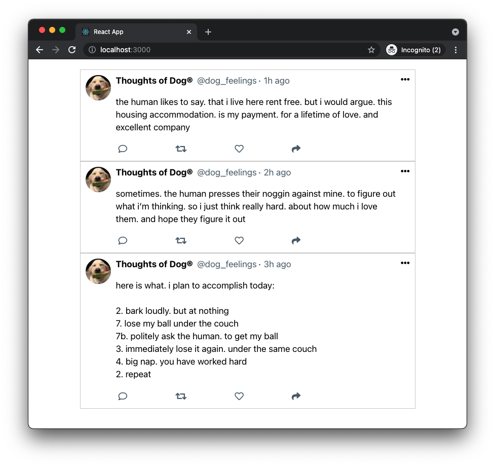 Once you are done refactoring the Tweet component, update App.js to display three <Tweet /> components. Each <Tweet /> should receive a separate tweet object from the tweetsArray.