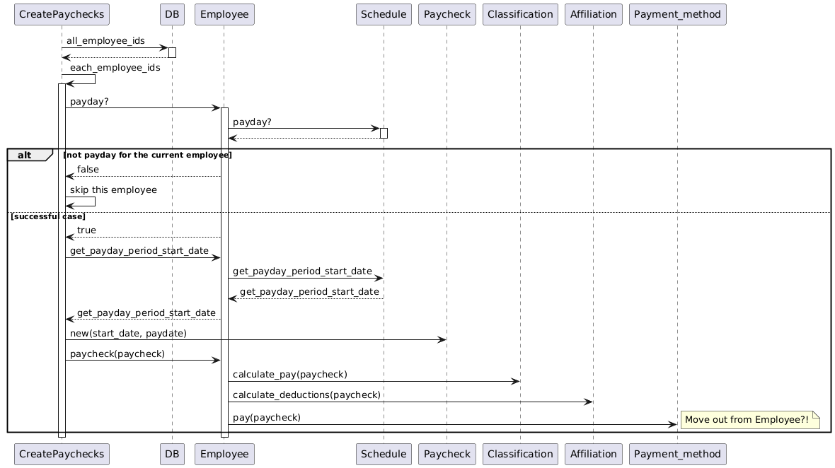 On receipt of the payday transaction, the system finds all those employees that should be paid on the specified date. The system then determines how much they are owed and pays them according to ther selected payment method.