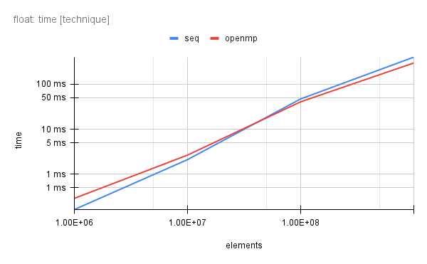 x and y using OpenMP. Each element count is attempted with various OpenMP