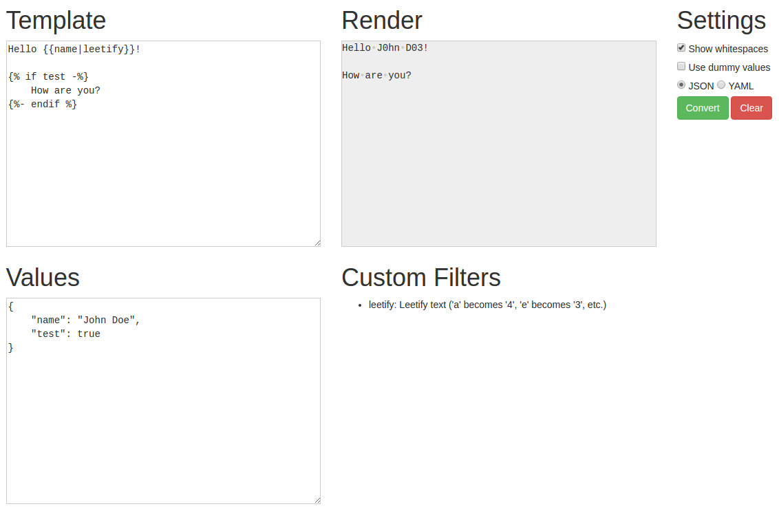 All you need is Python and preferably pip. Can parse JSON and YAML inputs.
