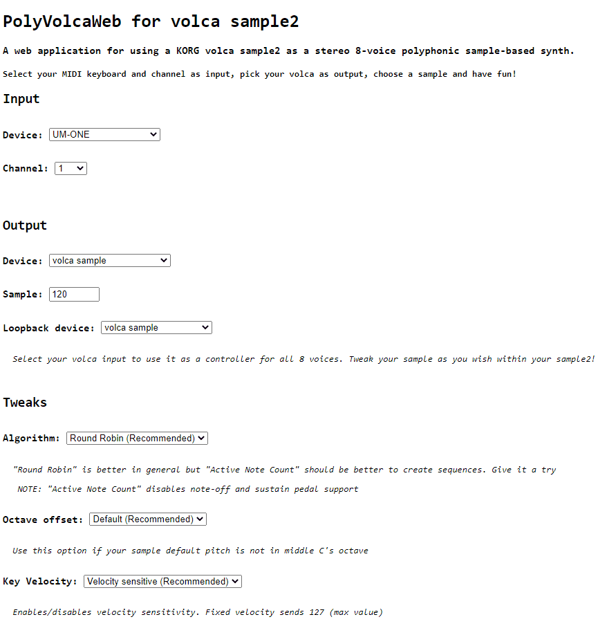 PolyVolcaWeb is a web application that transforms a KORG volca sample2 into a stereo polyphonic sample-based synth. Available at https://polyvolca.rafaelpernil.com