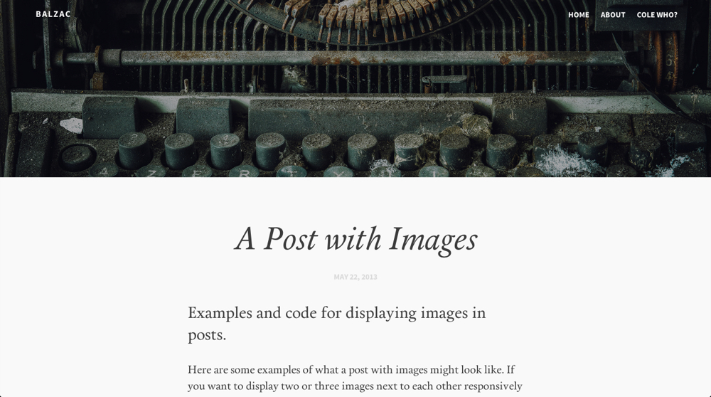 This makes the assumption that the feature image is in the images folder unless it has a link address. To add a feature image to a post or page just include the filename in the front matter like so.