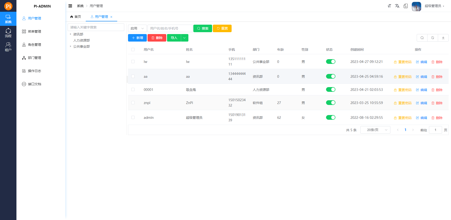 pi-admin 是基于 Spring Boot 2.7.12、MyBatis-Plus、Spring Security 等主流技术栈构建的后台管理系统。