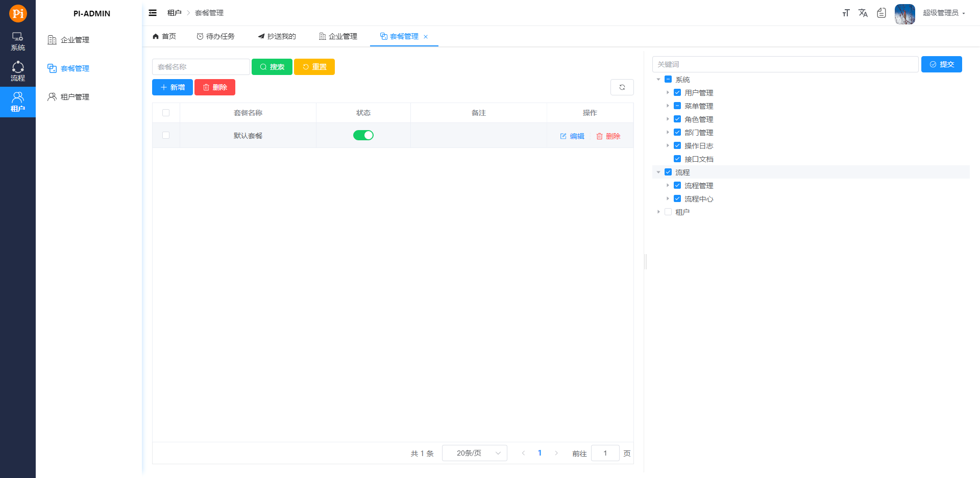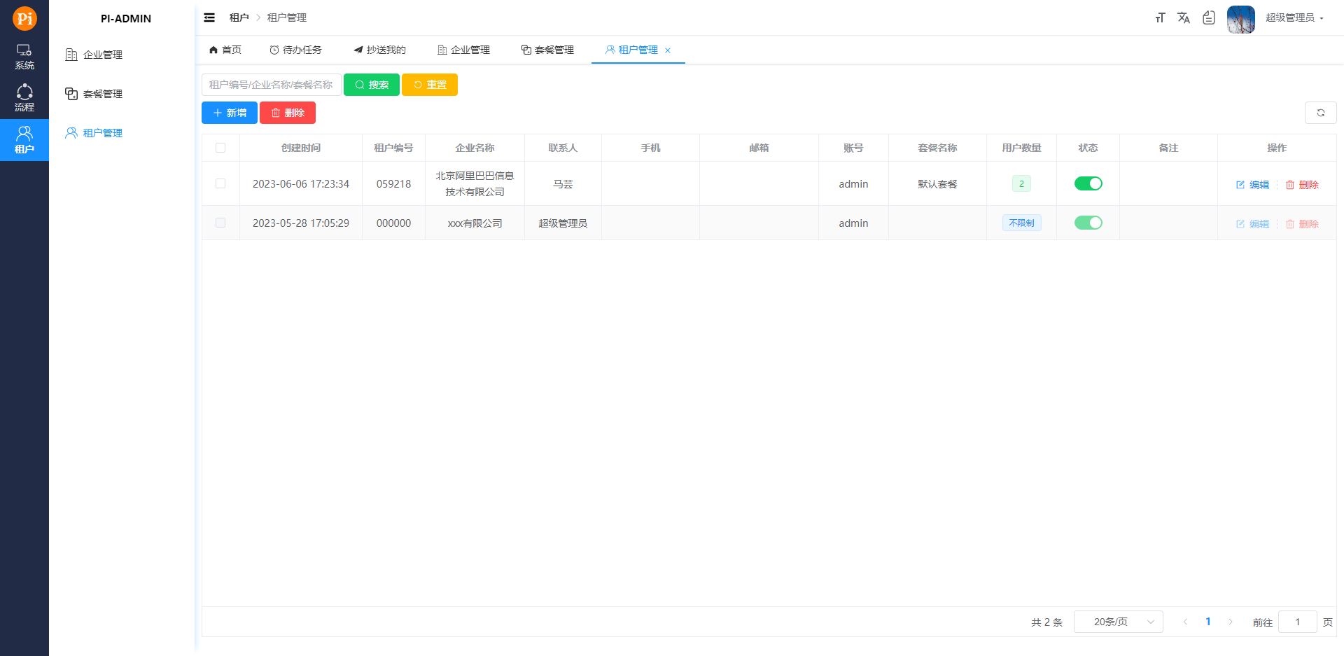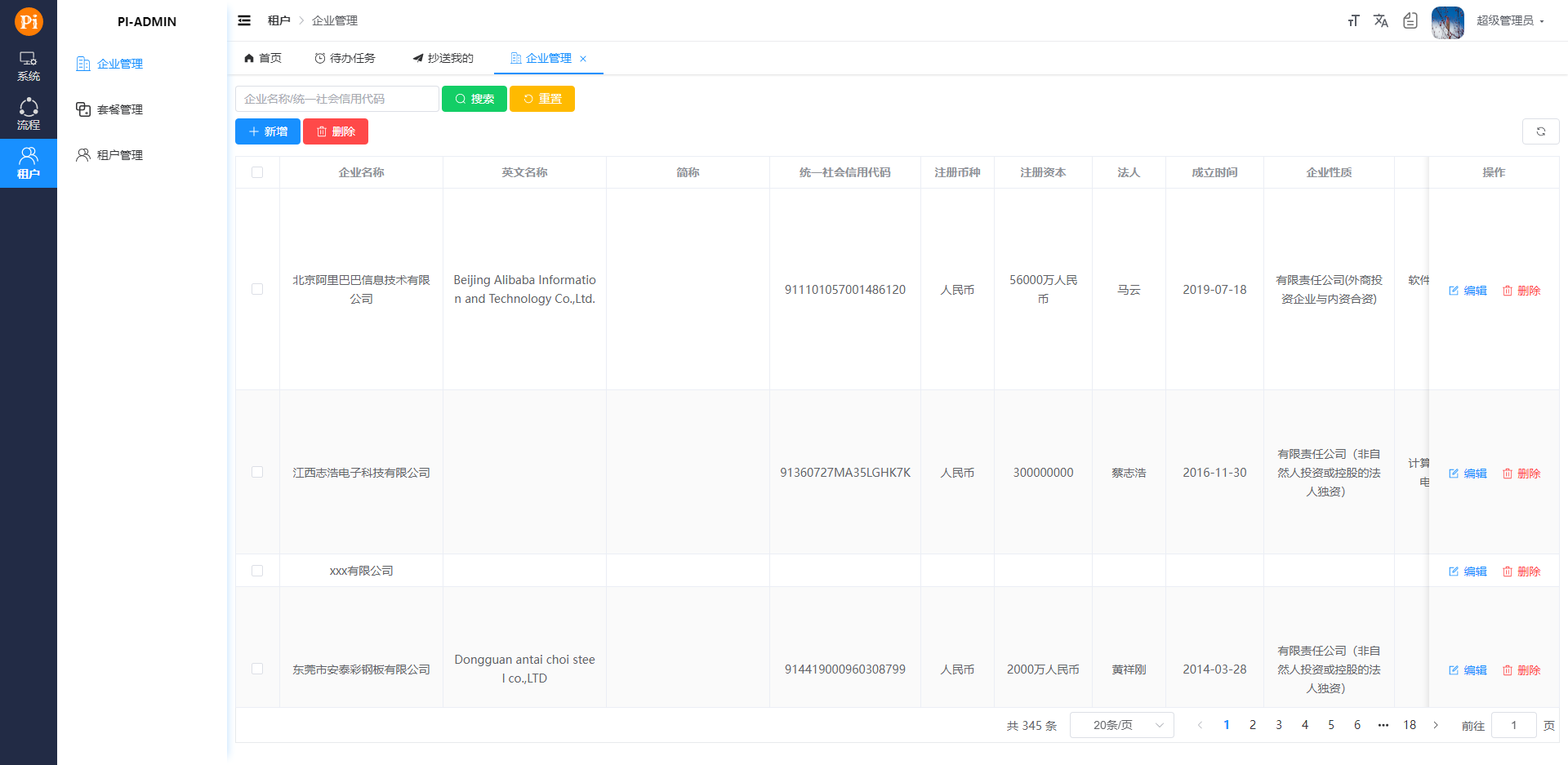 - 企业管理 管理企业信息,用户根据企业信息新增租户,一个企业对应一个租户。