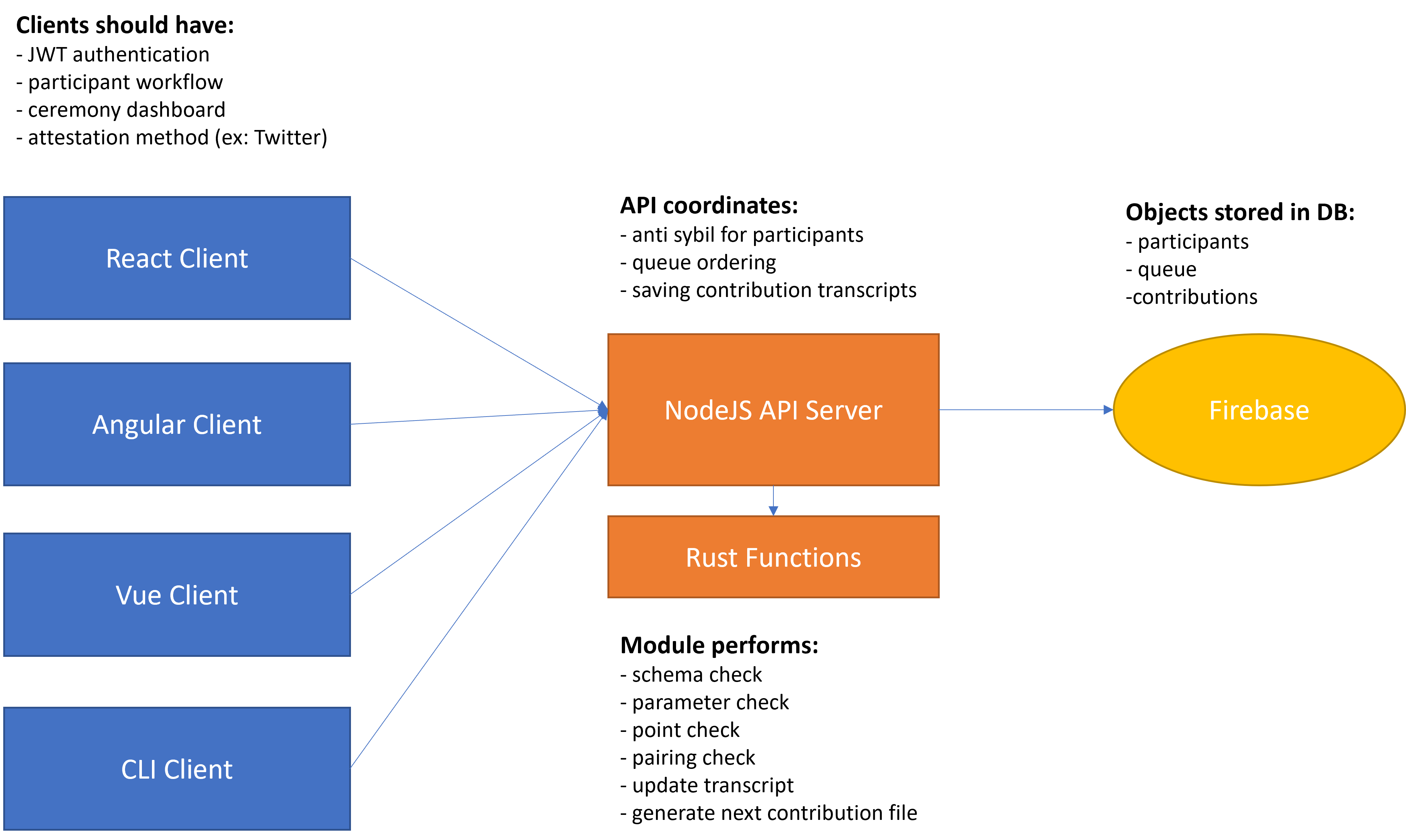 This web server was developed to be use in Trusted Setup Ceremonies. The API server acts as a coordinator for all participants to login, join the queue, download the transcript and start the computation. It can be used by other developers and teams to building their own client implementation. To learn more about this API check out the KGZ Ceremony Specs.
